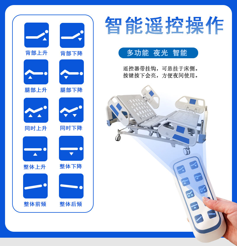 (3)整體升降:整床升降、整床前傾、整床后傾,通過遙控操作減輕護理人員的麻煩,方便對臥床人員進行洗頭、洗腳等護理工作。