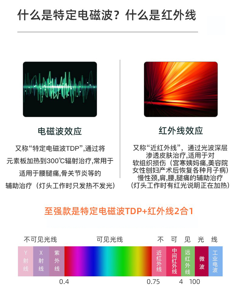 近紅外線或稱短波紅外線,波長0.76~1.5微米,穿入人體組織較深,約5~10毫米;遠(yuǎn)紅外線或稱長波紅外線,波長1.5~400微米,多被表層皮膚吸收,穿透組織深度小于2毫米。
